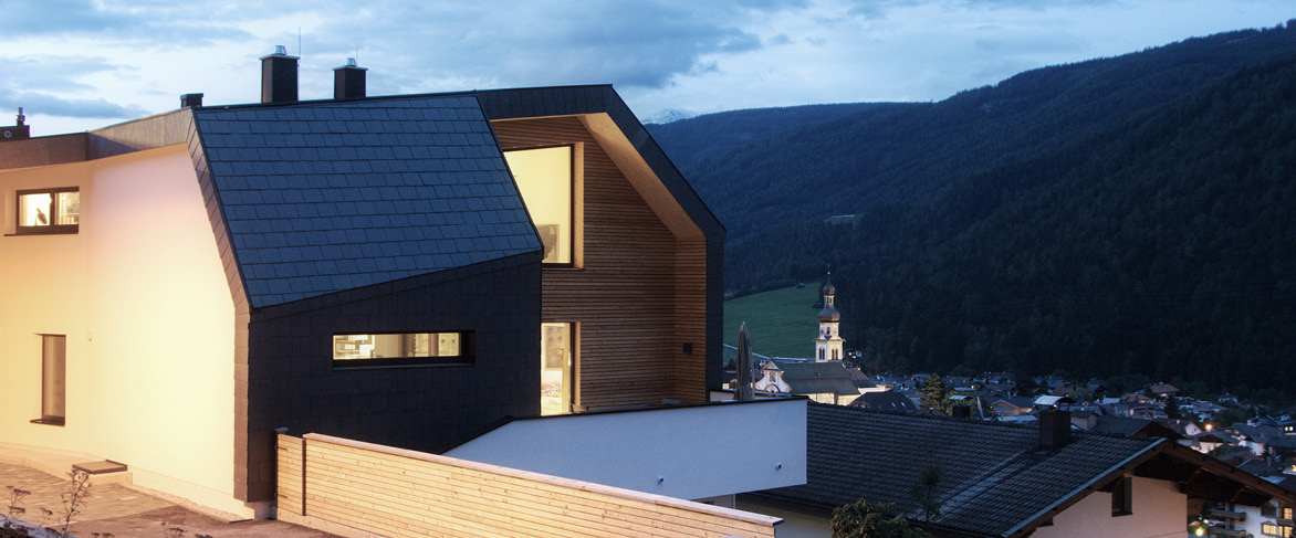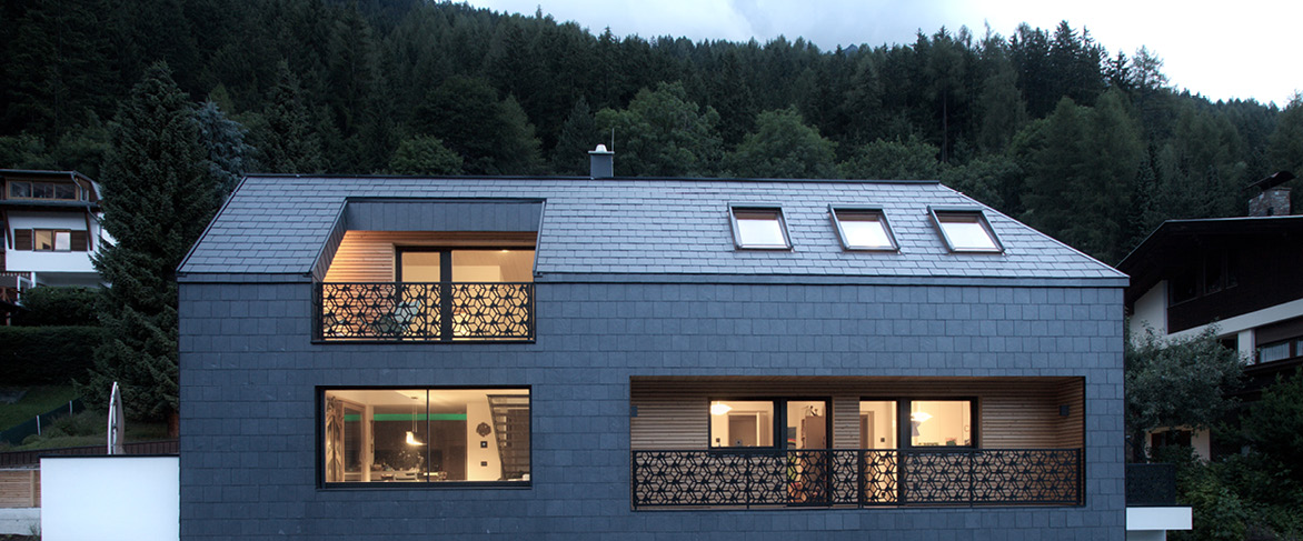 Der Wohnbau in Fulpmes ist geräumig und robust. Die Weiterführung des Daches verziert das Gebäude mit einem extravaganten Flair.